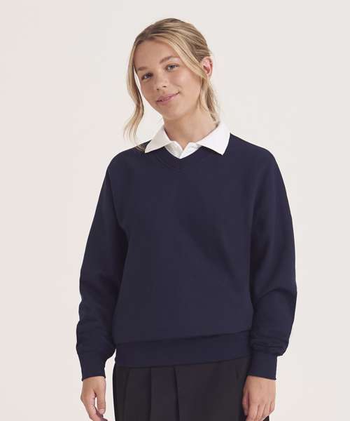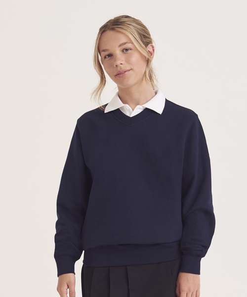 V-neckline sweatshirt. Ribbed neckline, cuffs and hemline. Soft cotton faced fabric creates ideal printing surface. Name label at back neck. Taped neck. Twin needle stitching for durability.