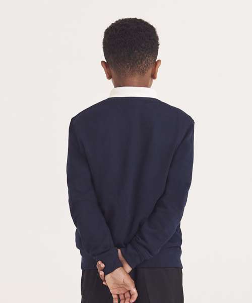 V-neckline sweatshirt. Ribbed neckline, cuffs and hemline. Soft cotton faced fabric creates ideal printing surface. Name label. Taped neck at back neck. Twin needle stitching for durability.