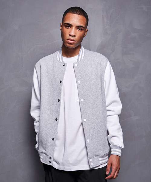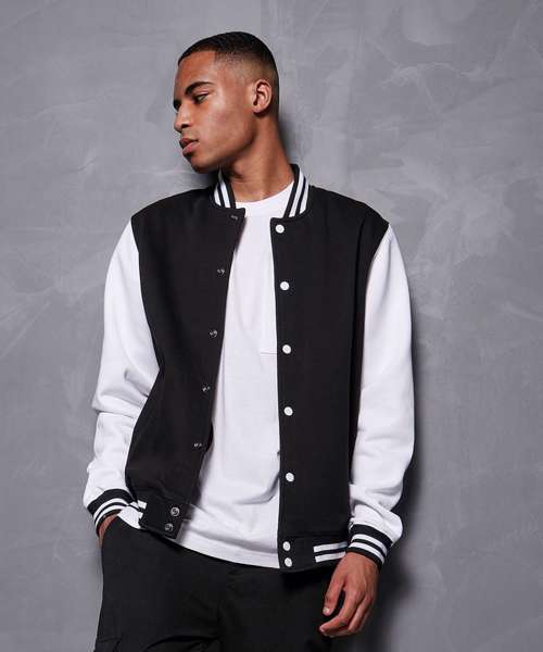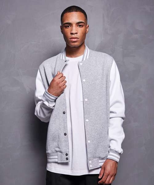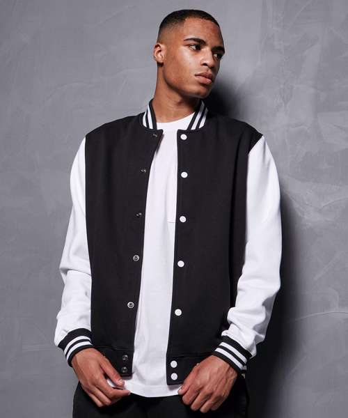 Sporty jacket for men in college style. Full-length button panel, wide ribbed hem and sleeve cuffs and side welt pockets. The cotton mix of the jacket is perfect for refinement and can easily be customised.