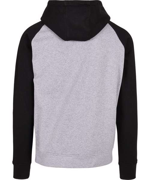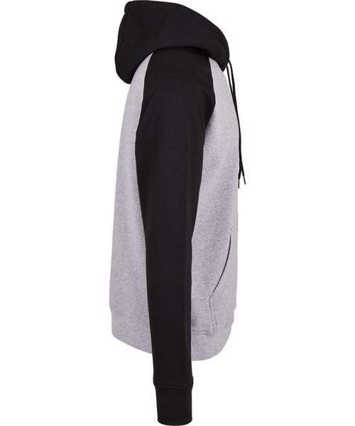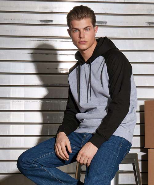 Raglan hoodie for men with contrasting sleeves. Hood, kangaroo pocket and wide cuffs on sleeves and hem provide the necessary comfort. The hooded sweatshirt is perfectly suited to be refined and can be easily customised.
