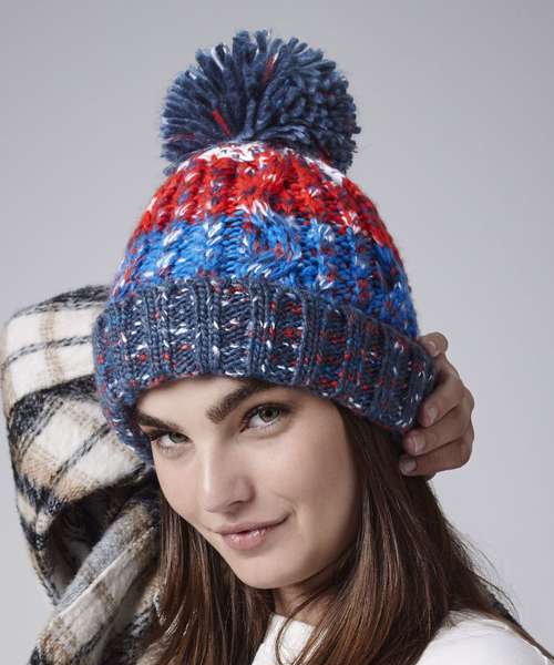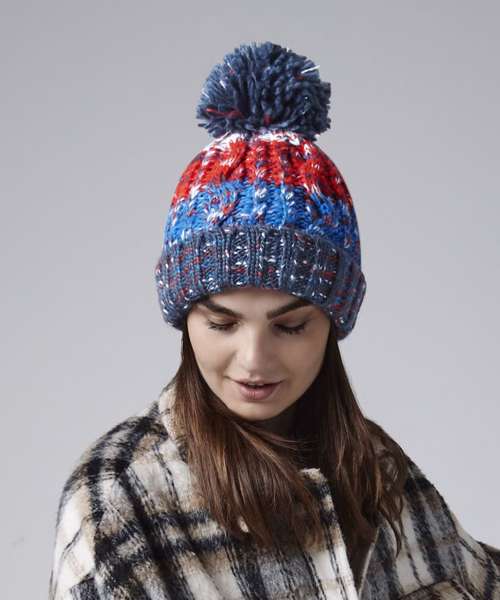 TearAway label for ease of rebranding. Cuffed design for optimal decoration. Heavyweight multi yarn cable knit design. Luxurious shearling thermal band for extra warmth. Luxury pom pom. Bold four colour stripe design.