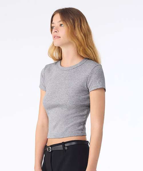 Crew neck binding. Mid-length. 1x1 micro rib. Fitted. Stretch fit. Set-in cap sleeves. Pre-shrunk. Side-seamed.