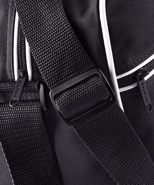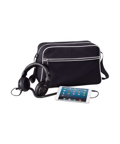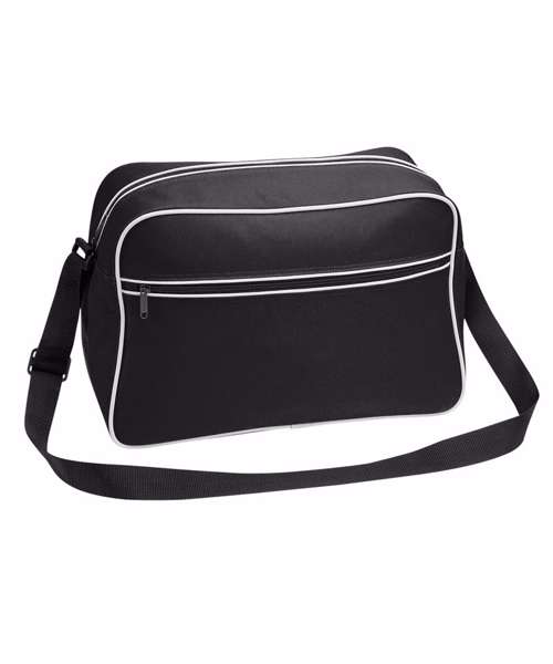 Retro styling. Adjustable shoulder strap. Zippered front pocket. Internal valuables pocket. Internal baseboard.