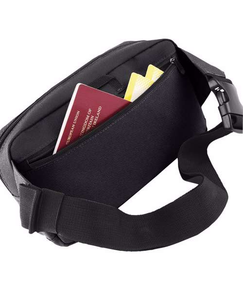 Adjustable webbing belt with secure clip fastener. Headphone port. Zippered rear pocket. Large zippered main pocket. Internal mesh pocket. Key hook.