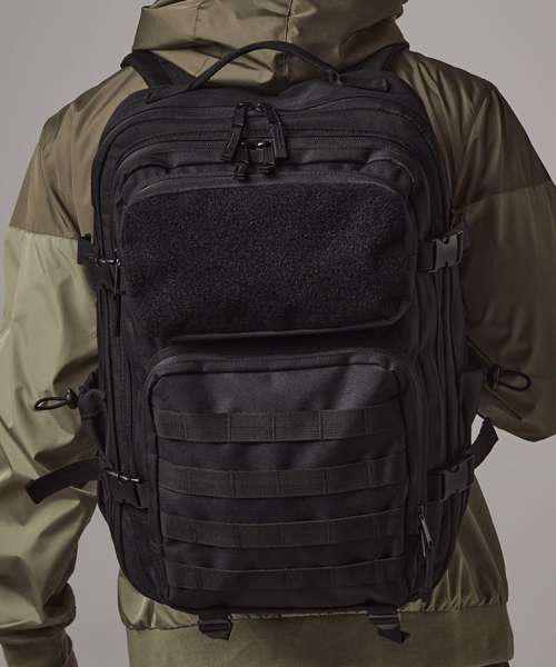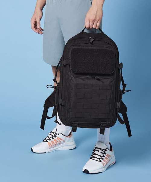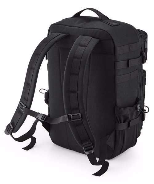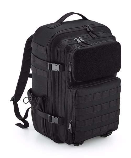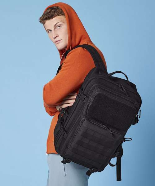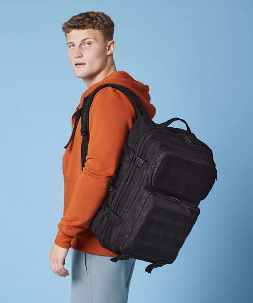 Military-inspired design. MOLLE webbing loop detail. Large main compartment. Padded laptop compartment, compatible up to 17". Full Rip-Strip™ front pocket for optimal decoration. Three large zipped front pockets. Dual tight-knit stretch mesh bottle pockets, capable of holding 750ml bottle shakers. Internal mesh pockets. Padded back panel. Large top carry handle. Compression straps. Ergonomically designed straps for everyday comfort. Fully adjustable chest strap. Compatible with Rip-Strip™ patches BG840 and BG841. Compatible with Modulr™ multi pockets BG241 and BG242. TearAway label for ease of rebranding.