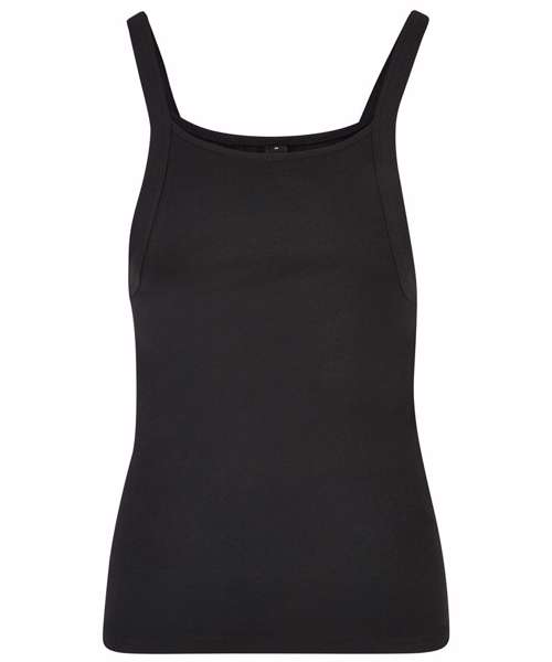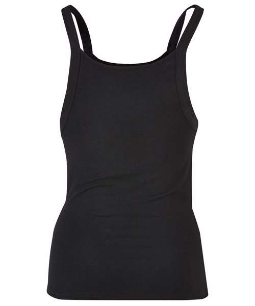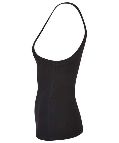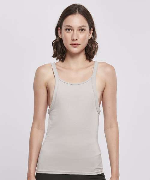 This women’s tank top features an urban look with extra-deep armholes and yet a slim fit that clings closely to the figure. Its wide shoulder straps flow into deep necklines on the front and back. The summery, sporty women’s top is made from cotton with a slight percentage of elastane. It can be refined further via embroidery, flock printing or screen printing.