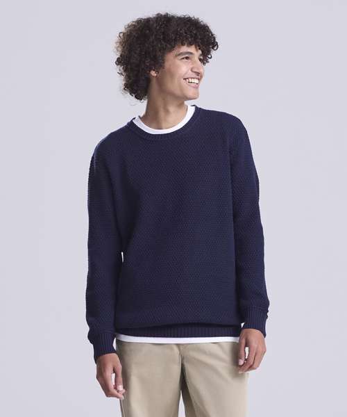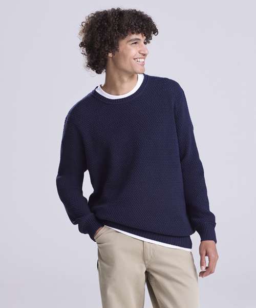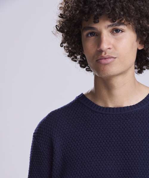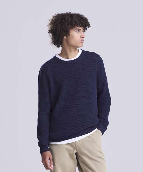 Regenerated cotton blended with recycled polyester sweater. Seed stitch knit with rib neck, cuffs and hem.