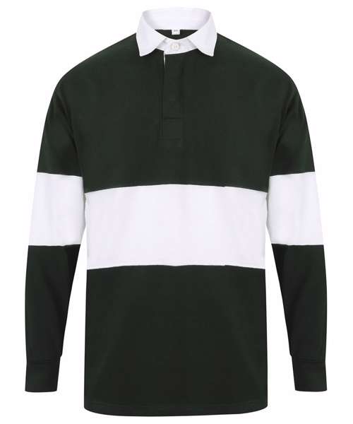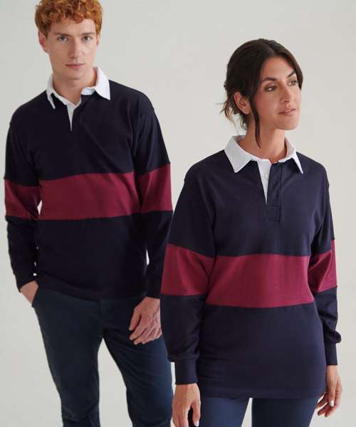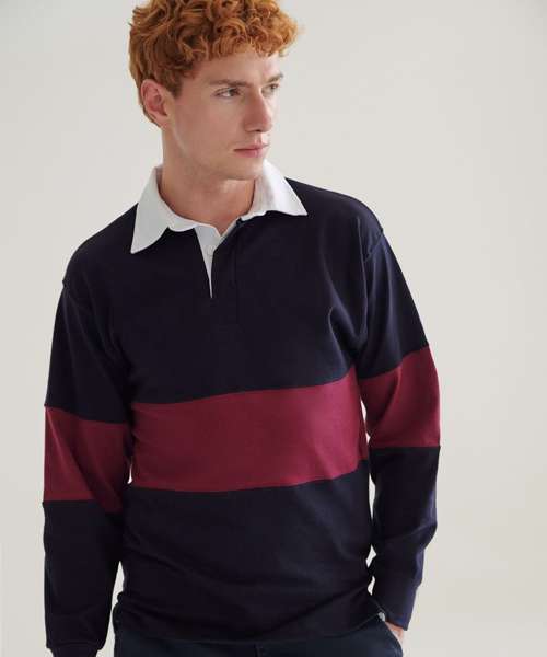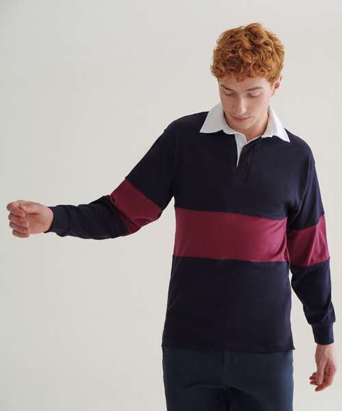 Tag free retro fit rugby shirt. Cut and sew contrast stripe panel around centre. Heavyweight single Jersey. Contrast traditional woven (twill) rugby collar. Herringbone back neck tape. Contrast herringbone taped side vents. Taped shoulders. Elastane reinforced ribbed cuffs for shape retention. Twin-needle hem. Topstitching at armholes and panels. Concealed button placket. Herringbone inner placket. 2 x rubber buttons.
