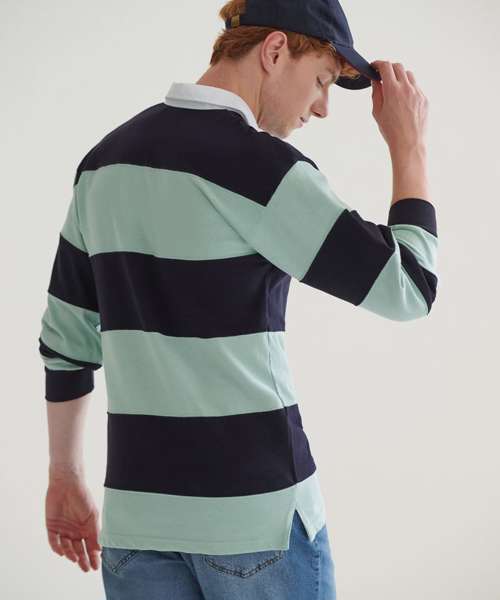 Sewn Stripe Rugby in heavy jersey. Traditional rugby collar with cotton webbing. Taped shoulders and side vents. Rubber buttons. Elastane re-inforced cuffs for shape retention. Twin-needle seams and hems. Rugby leisurewear garments are for leisure use only.