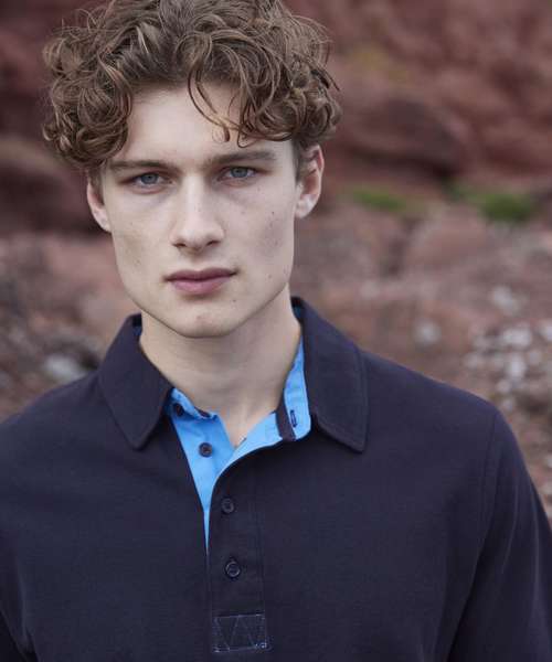 Piqué polo with self fabric side panels. Tonal flat lock stitch detail on panel seams. Contrast woven placket and inner collar band. Self fabric collar. Zigzag contrast stitching on placket box. Contrast herringbone tape in side vents. Contrast tipping on cuffs. 4 button placket with dyed to match buttons.