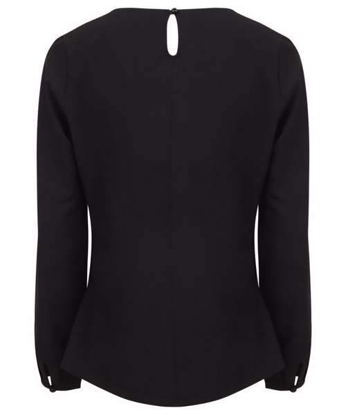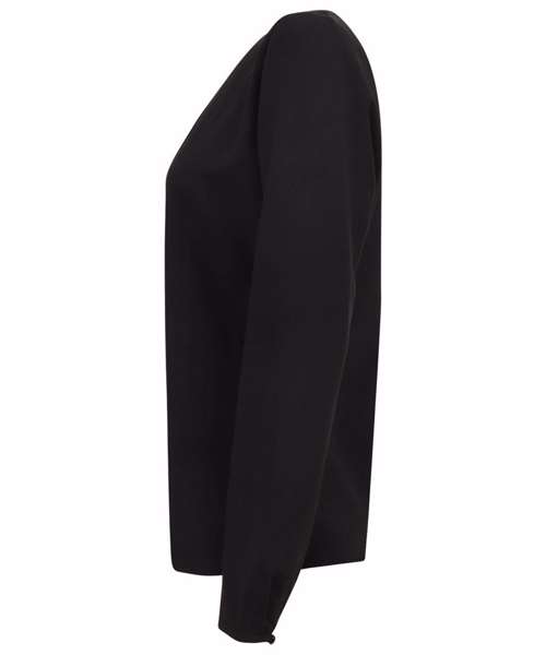 Pleat front blouse. Single button back neck opening. Set-in long sleeve. Slightly gathered sleeve at cuff with keyhole opening and button fastening. Slightly curved hem. Fabric contains easy care, wicking, anti UV, quick-drying properties.