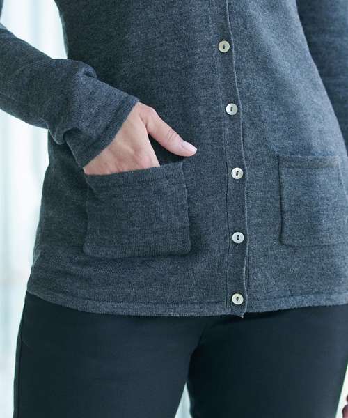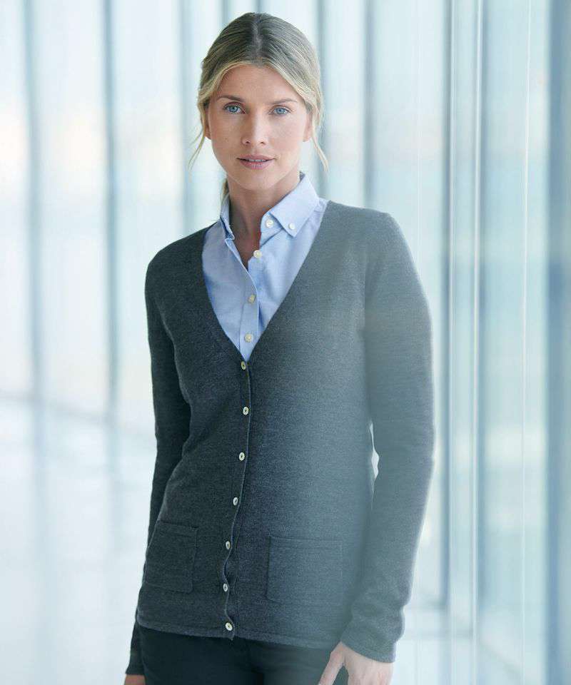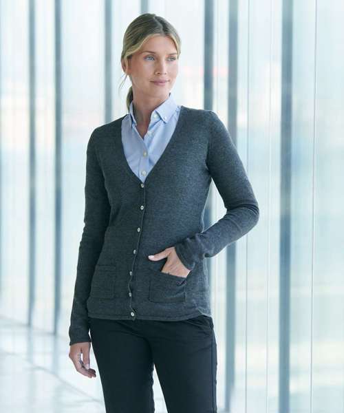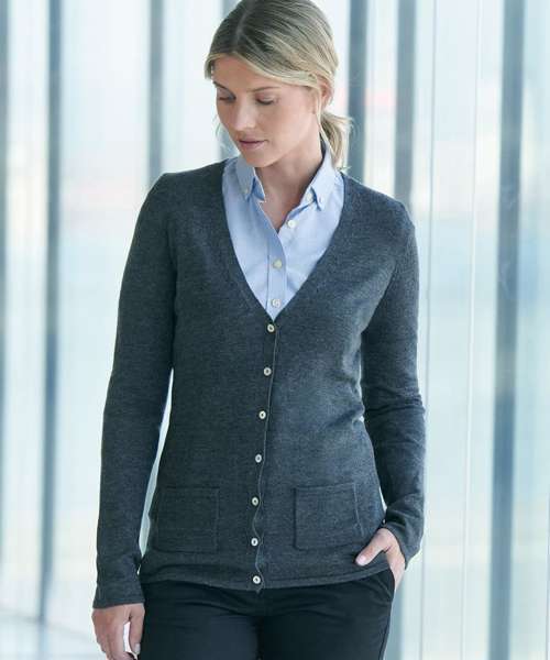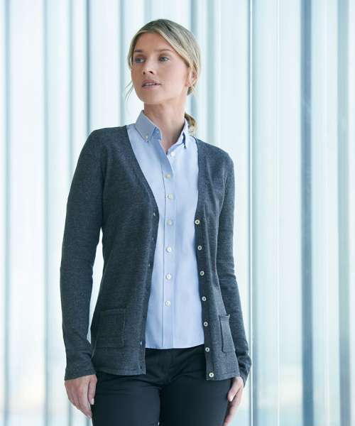 This V-button cardigan offers a modern style long cardigan with pearlized buttons in a quality fine knit made to perform. This style is part of our 50 cotton/50 acrylic range where you can mix and match your styles.