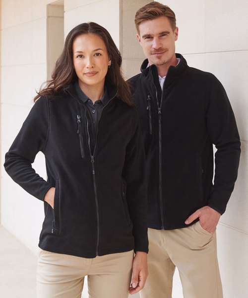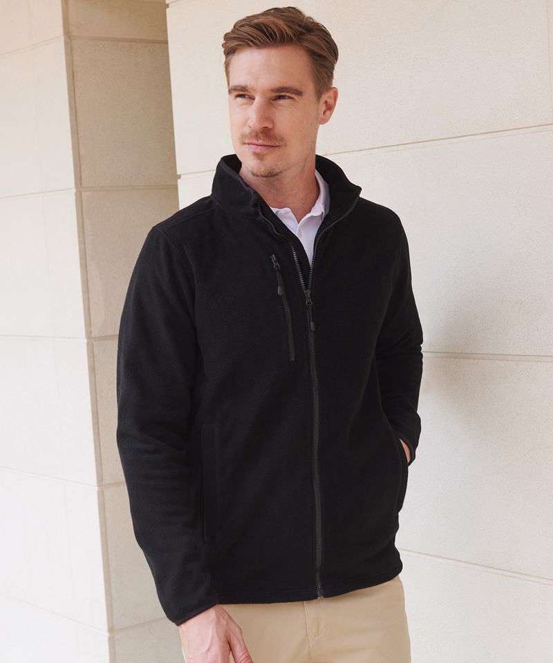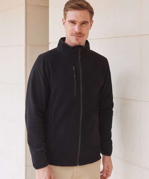 Fabric using recycled materials. Made from recycled polyester. Anti-pill microfleece. Recycled zips. Set-in sleeves. Shoulder panel. 2 single welt zipped pockets. Zipped chest pocket. Back neck tape. Back neck outer hanging loop. Full-length front zip with zip guard and facing. Non-slip zip pulls. Stretch binding on collar and cuffs. Henbury cut-out label for easy rebranding.