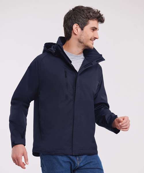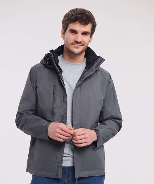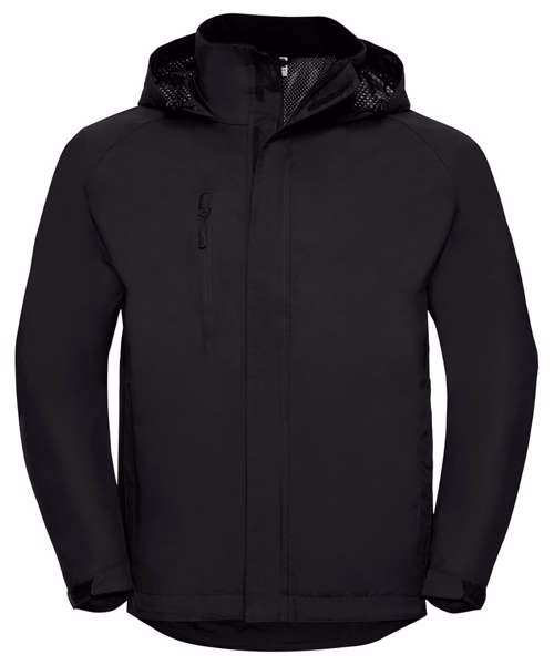 Water resistant garment. PU coated with critically taped seams, fabric is waterproof to 2000mm and breathable: 2000gsm per 24 hours. Active fit: articulated elbows, raglan sleeves and concealed hood. Advanced features include; zipped handwarmer pockets with internal pocket for phone/MP3, storm flap with rain channel, reversed zips and soft touch inner collar. Concealed 3 piece hood, fully lined with discreet concealed decoration access at hem.