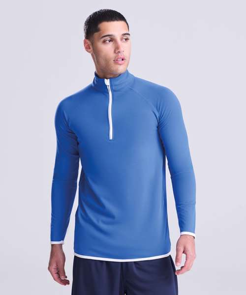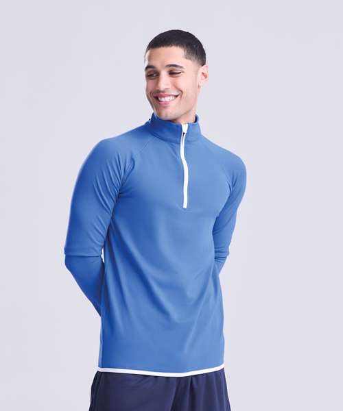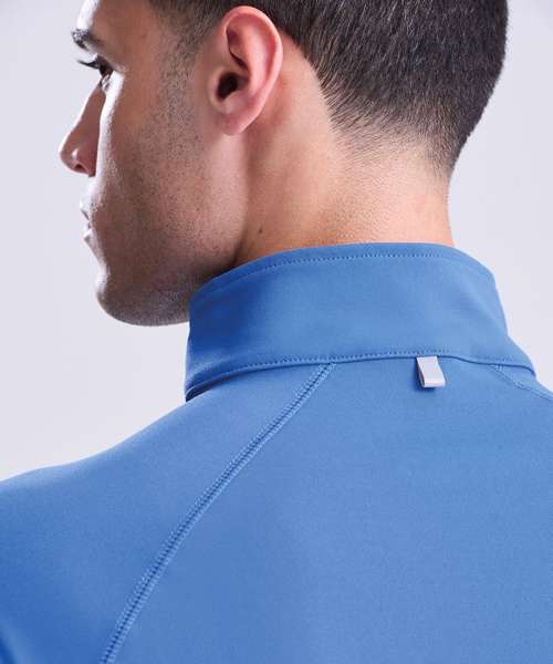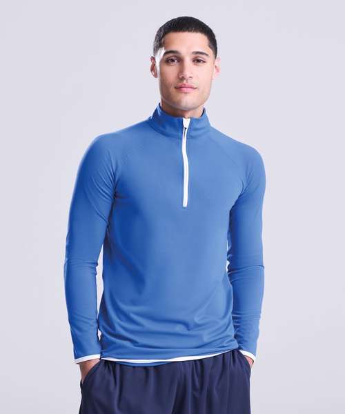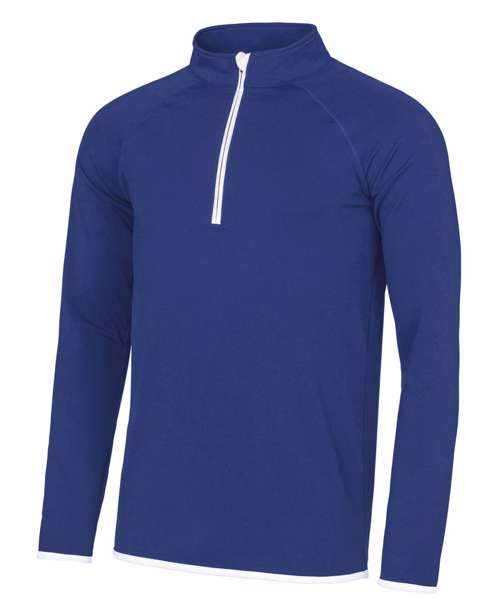 AWDis' own CoolFit blended fabric containing elastane that provides stretch for comfort and a great fit, tight fit, reflective tab on back of neck helps keep ear phone cords in place, self-fabric contrast colour binding at zip, cuffs and hem, raglan sleeve design creates ease of movement, ½ zip with stand-up collar for warmth, chin guard prevents irritation, simple tear off label makes it perfect for rebranding, UPF 30+ UV protection.