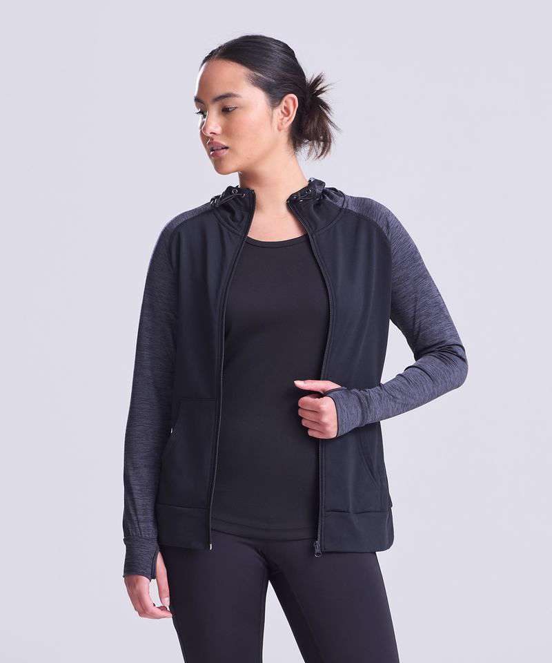 Feminine fit sports zoodie with adjustable drawcords hood, raglan sleeves with thumb holes and full-front zip. Contrast fabric on sleeves and body.