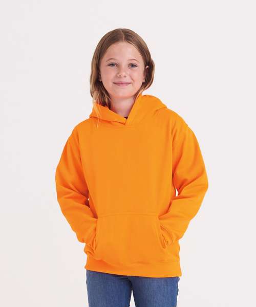 Vibrant eye-catching colours. No drawcord to comply with EU regulation. Twin needle stitching detail. Kangaroo pouch pocket. Ribbed cuff and hem. Simple tear-out label. Brushed inner fleece.