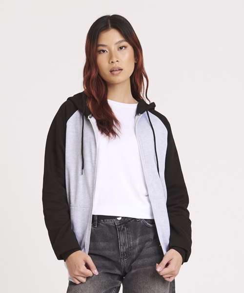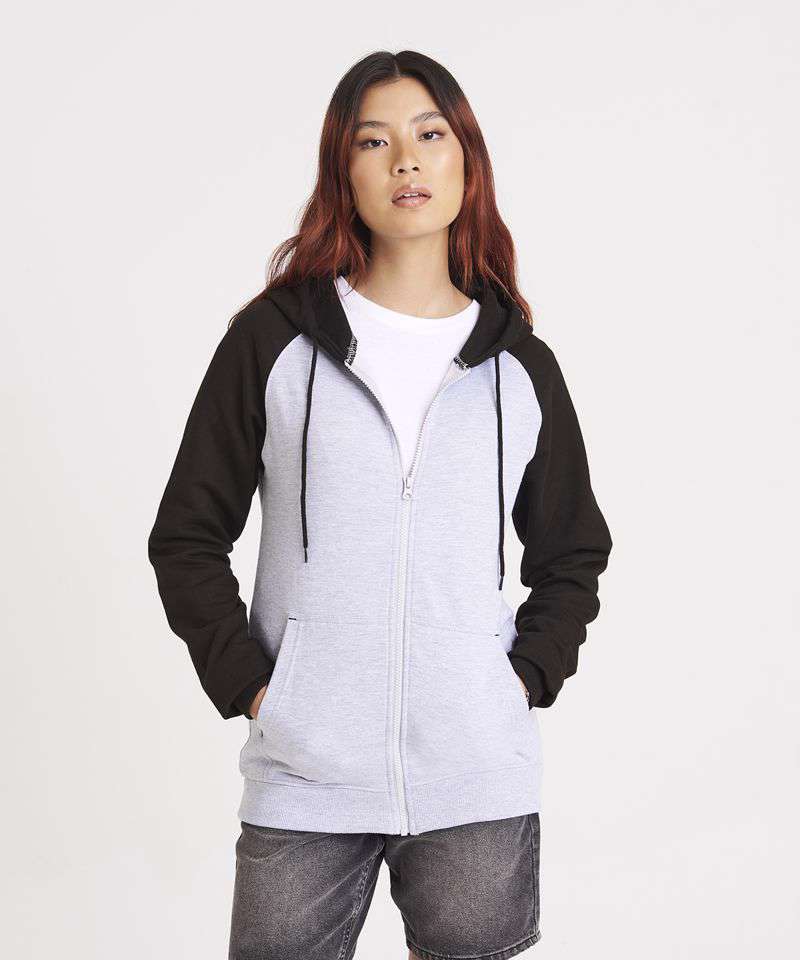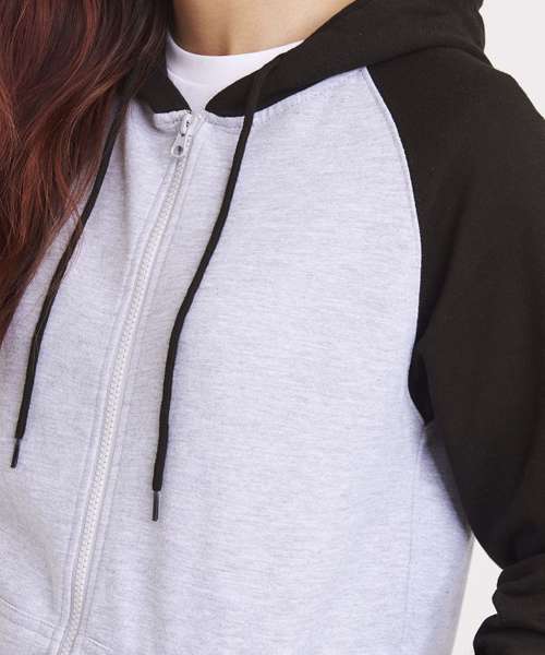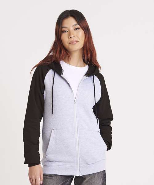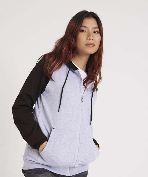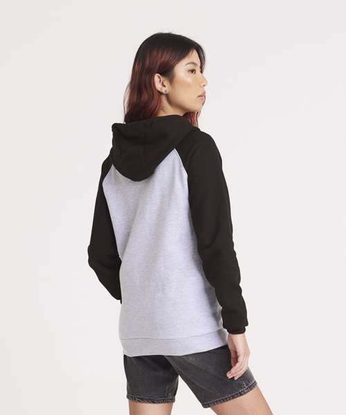 Twin-needle stitching detail. Contrast raglan sleeves. Double fabric hood. YKK plastic zip. Contrast flat lace drawcords. Spilt kangaroo pocket. Ribbed cuffs and hem. Soft cotton faced fabric creates ideal printing surface. Simple tear-out label makes it perfect for rebranding. Brushed inner fleece.