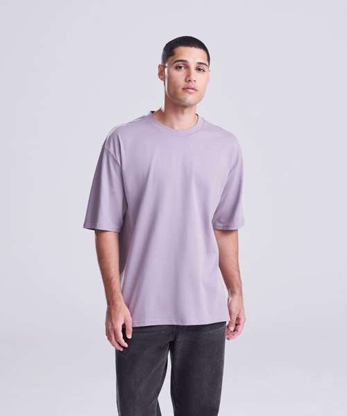 Oversized fit with side seams. Short sleeves. Ribbed crew neck style, with taped neck. Set-in sleeve. Size label only, for easy rebranding – colour-coded black for unisex. Combed ringspun cotton for ultra comfort. Surface excellent for print or embroidery. Twin-needle stitching detail on sleeves and bottom hem.
