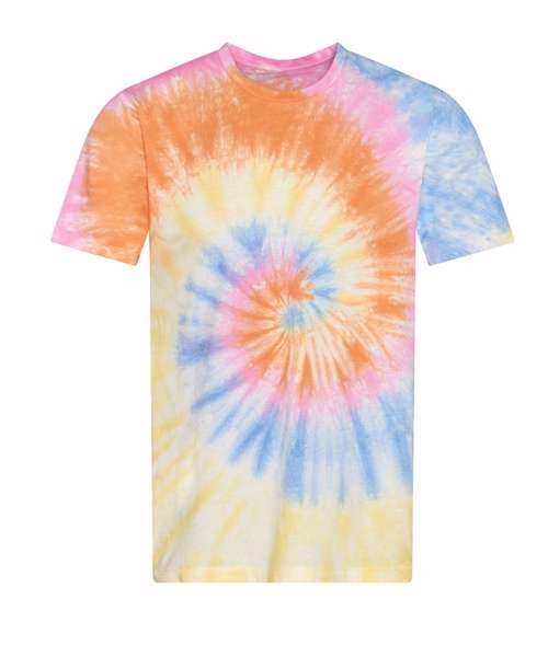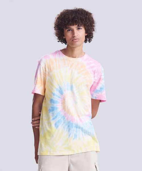 Modern fit with side seams. Short sleeves. Tie-dye design. Every piece is unique. Size label only, for easy rebranding – colour-coded black for unisex. Combed ringspun cotton for ultra comfort. Surface excellent for print or embroidery. Taped neck. Ribbed crew neck style. Twin-needle stitching detail on sleeve and bottom hem.
