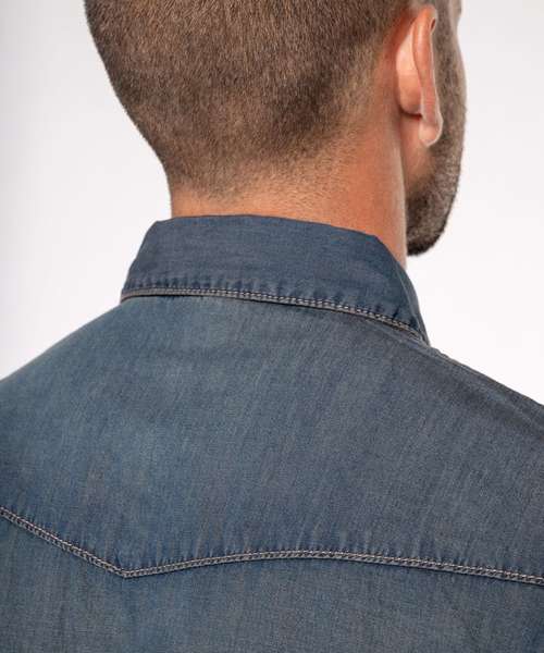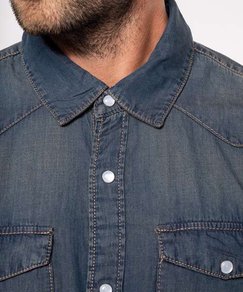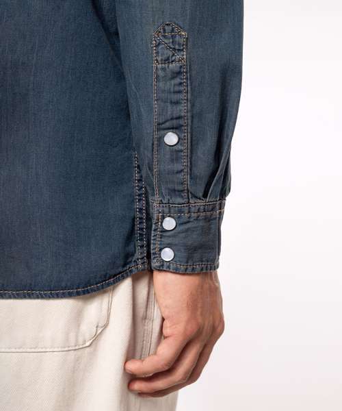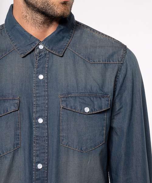 100% cotton. Enzyme-washed shirt. Fitted style. Decorative stud buttons. 2 studded chest pockets with flap. Front and back yokes. Studded cuffs. This product has been specially treated and appears intentionally aged. This manufacturing process results in colour variations between products and makes each piece unique.