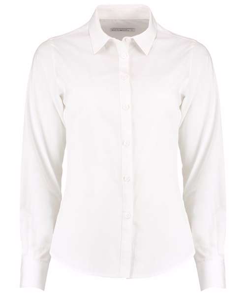 Fused soft stand up collar (no stiffeners) collar. 7-button placket with self-coloured buttons. Rounded hem. Single stitching around armholes. Double-stitched sleeves and side seams. Back yoke. Adjustable 2 button cuff with pointed no button cuff placket. Under bust darts. Back darts from hem to under arm point. Spare button. Kustom Kit® woven back neck label. Made with 65% recycled polyester.