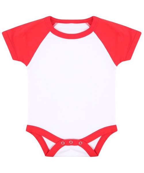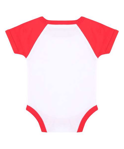 Retro styling baseball bodysuit with contrast sleeves and binding on neck and leg opening. YKK popper fastening at bottom for ease of access and size tab only for easy relabelling.