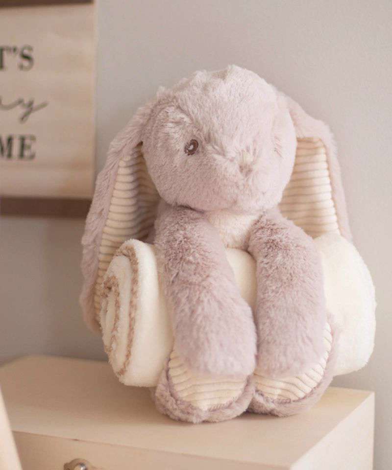 Light Brown soft plush rabbit. Contrast cream corduroy under ears and on paws. Hook and loop fastening on paws. Separate cream blanket in microfleece with contrast blanket stitching on edge. Delivered in a presentation bag with cream ribbon. Remove all hang tags and their fasteners before giving these items to a child. Suitable for children of all ages. Complies with EN71 European Toy Safety Regulations.