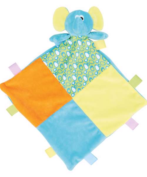 Multi-coloured elephant comforter with internal rattle. Bright blanket with patchwork panels and fabric tabs. Zip access on the comforter to allow for direct access to print or embroider. Complies with EN71 European Toy Safety regulations. Remove all hang tags and their fasteners before giving these items to a child. Suitable for all ages.