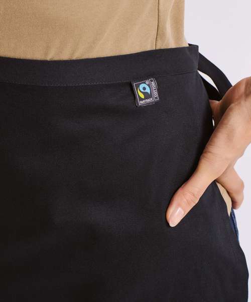 This half apron is made from 100% certified Fairtrade cotton. The apron is labelled with the official Fairtrade logo.