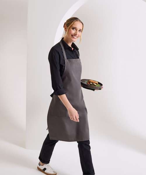 A heavyweight full length bib apron made from a combination of certified recycled polyester and certified organic Fairtrade cotton. Featuring two slanted side pockets and fully height adjustable with a buckle on the neckband. Two slanted side pockets measuring 24cm depth by 18cm wide. Adjustable buckle with gun metal finish. 86cm long x 72cm wide with 90cm long ties.