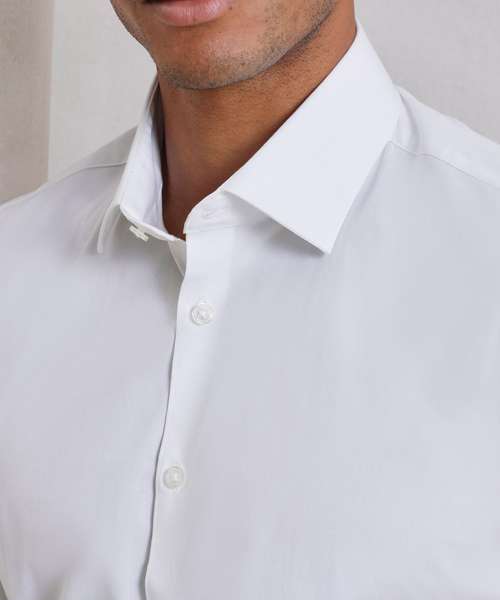 Cotton combined with elastane makes for a super soft and stretchy comfortable fitted style for men. A stiffened cut-away collar with top button which can be worn formally with a tie or open collared for a more relaxed look.