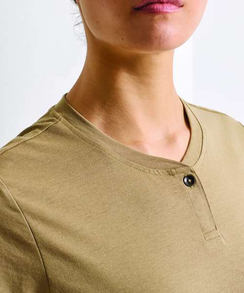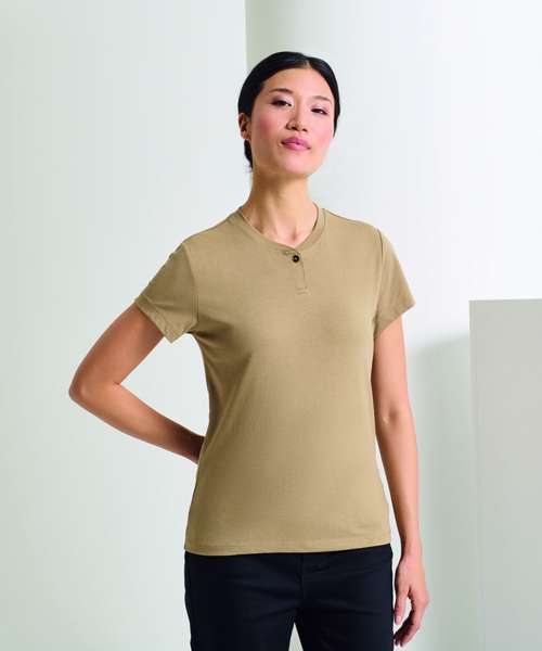 A popular style for service staff, this women’s short sleeve t-shirt is made from a combination of certified recycled polyester and cotton. Designed with a single button on the placket and a narrow banded collar, this style has a soft feel to the fabric.