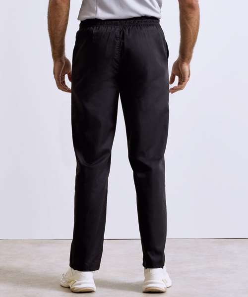Unisex pull on chef’s trouser. Available in Black or White check or plain Black. Elasticated waist for easy pull on trouser. Unisex sizing. 30.5" inside leg. Side swing pockets. Drawcord.