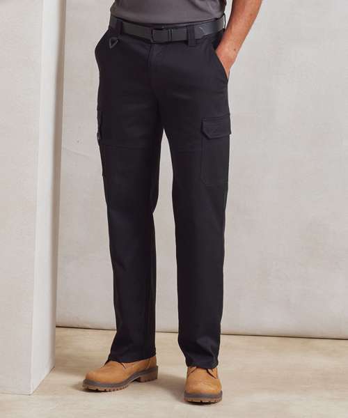 Durable work cargo trousers with Premier's Stretchchecker fabric for stretch and a comfortable fit. Belt loops and two-button fastening to the waistband. Covered YKK zip fly. Side sling pockets. Multiple mobile friendly, cargo-style pockets with hook and loop fastening. Single patch pocket to the reverse. Two leg lengths. Unisex styling. Contains certified recycled polyester.