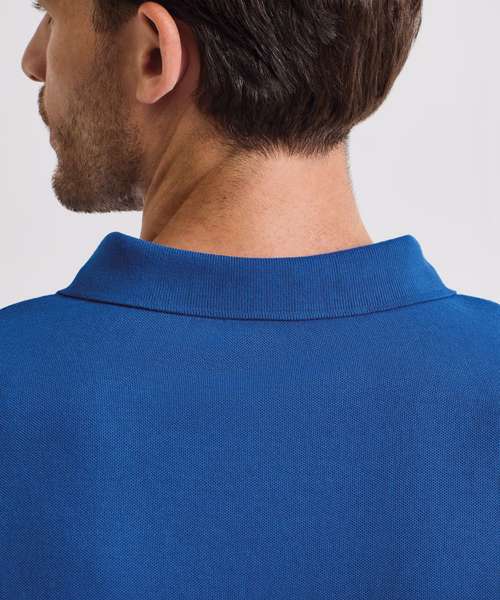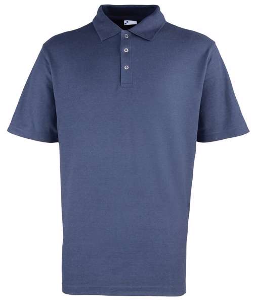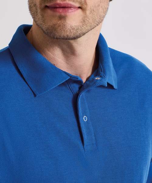 Heavyweight pique polo shirt with 3 rust-free studs on placket. Covered seams across shoulders and down arms, extra body length. Knitted collar.