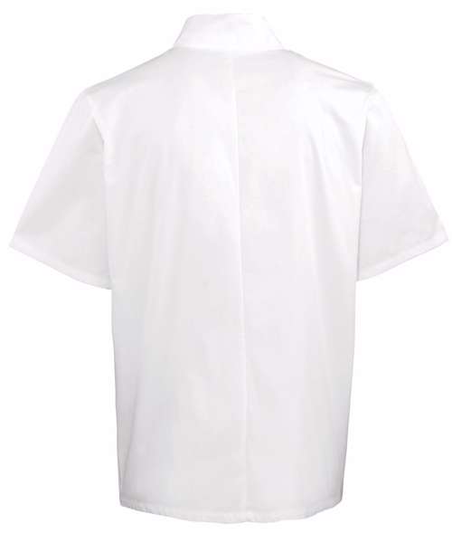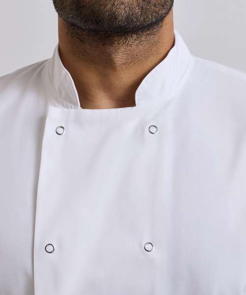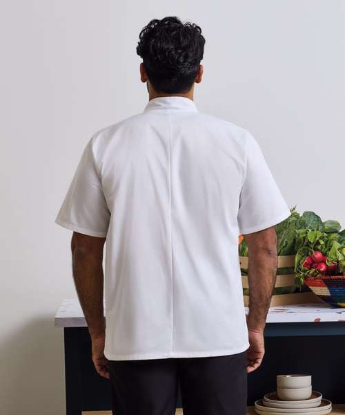 An easy-wearing short sleeve chef jacket with ten metal press studs in a popular wrap over style. Features a Mandarin Collar with topstitching and is available in Black or White.