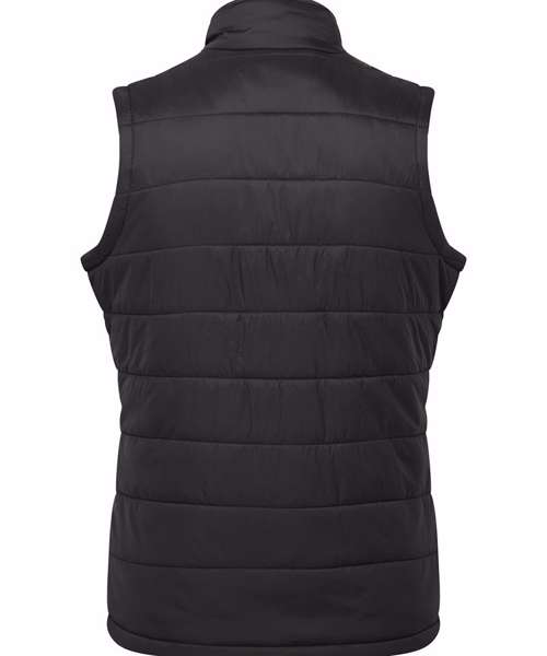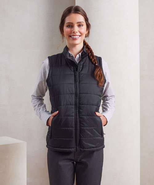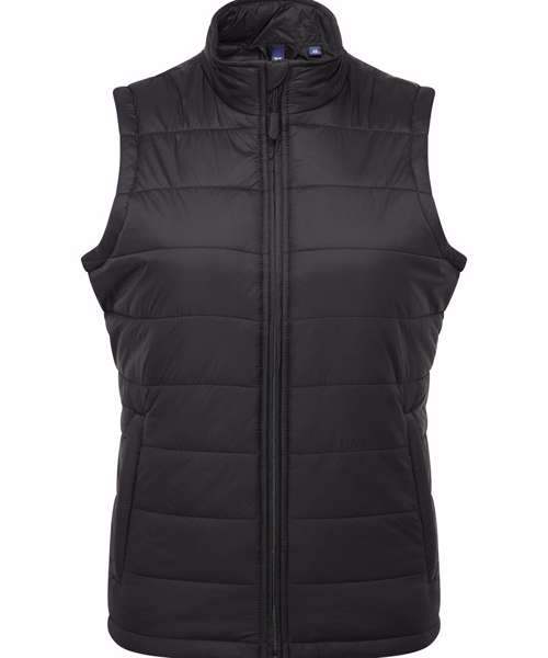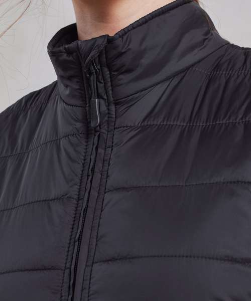 Women’s padded zip-through gilet with horizontal stitching to form baffles, ensuring an even distribution of insulation. Covered zip with chin guard and zip guard to the inner. Styled with a cadet collar. Two welt jet zipped side pockets with a single open pocket to the inner for handy storage. Full embroidery access to the entire bodywarmer through an internal zip in the lining. Lightweight and folds downs easily into its own stuff sack. Made with 100% certified recycled fabrics.