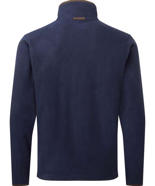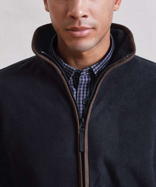 Men’s long sleeve fleece jacket with contrast trim detail. High neck rounded collar, leading into a two-way zipper. Two zipped external pockets and two internal open pockets. Stitched side panel detail. Elasticated cuff with trim detail. Contrast fabric hook on back of collar for hanging up.