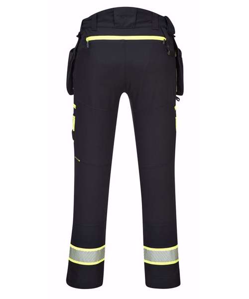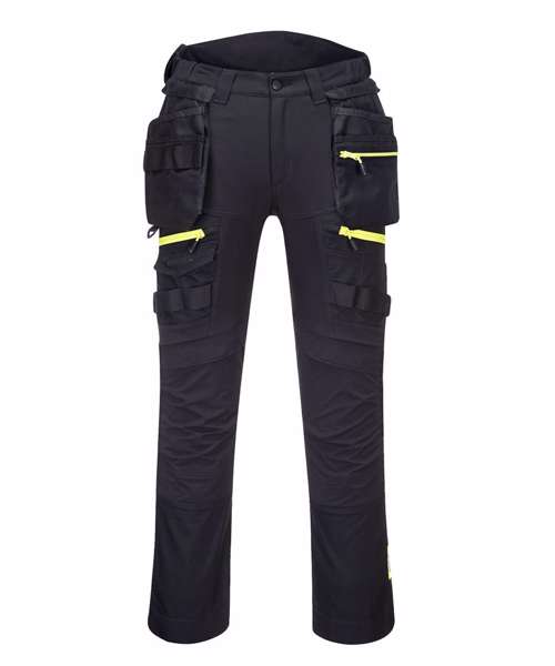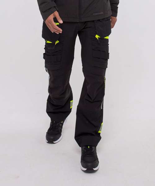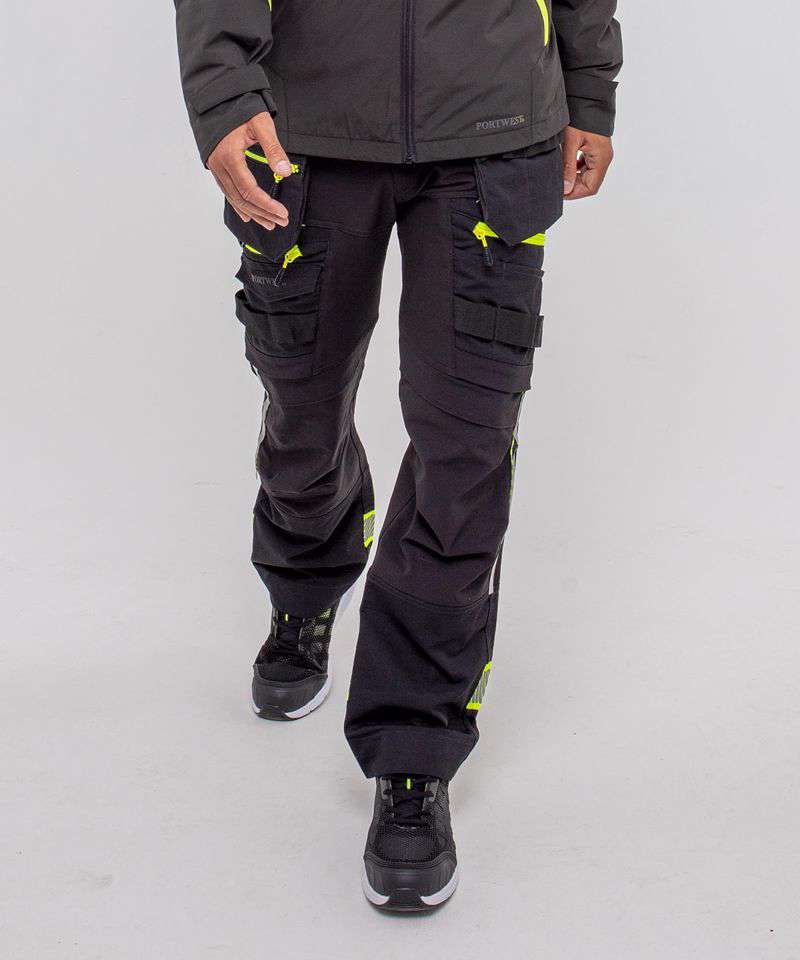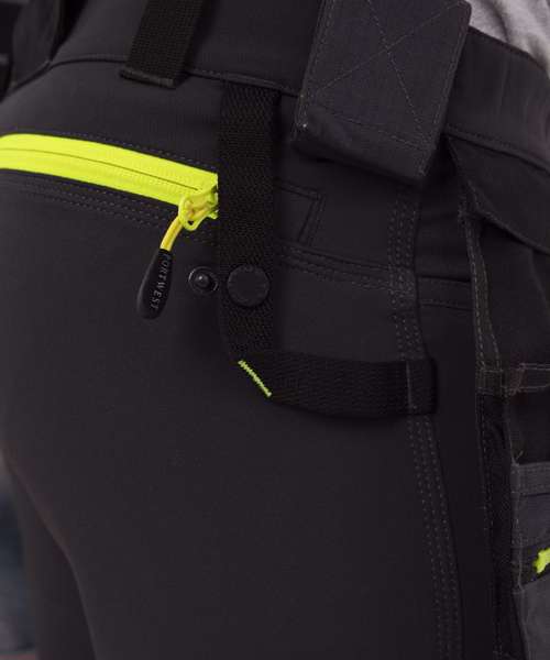 Four-way stretch fabric for ease of movement and added comfort. High-rise back waistband ensures protection in all working positions. Reflective trim for increased visibility and safety. Zip-off holster pockets for added versatility. Two-tier kneepad pockets offer two positioning options. Multiple side zip compartments for secure storage. 16 pockets for ample storage. Two side zip pockets for secure storage. Smartphone pocket. Hammer loop for secure storage of work tools. Two back pockets. Two zipped thigh pockets. CorePro reinforced thigh pocket. Welt pocket. CorePro reinforced holster pockets with webbing loops for tools. Stretch crotch gusset provides maximum flexibility and reduces stress. Side elastic waist for ultimate wearer comfort. Webbing belt loops for extra durability. D-ring for keys or ID cards. Bartacked at all stress points. Pre-bent knees allow for increased freedom of movement. Triple-stitched seams for extra durability. Extendable leg length (31" to 33"). Slim fit design for exceptional comfort.