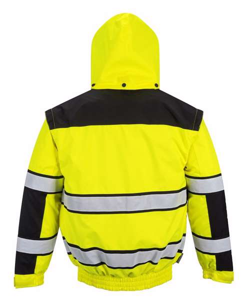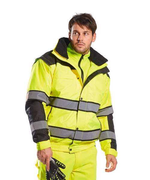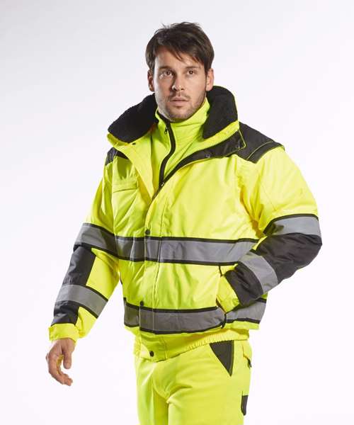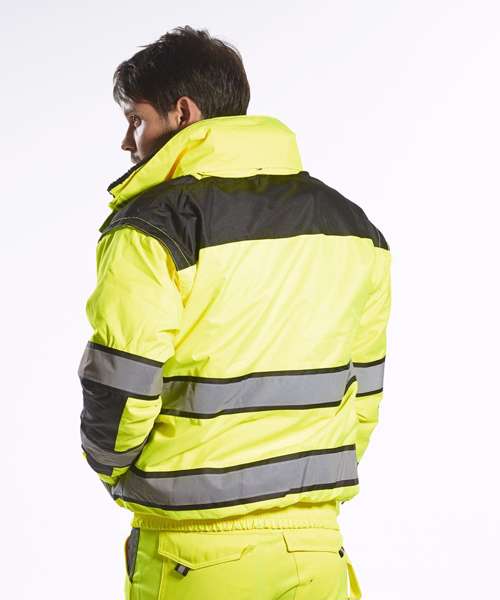 Extremely water resistant PFAS free Texpel™ Splash Eco fabric finish, water beads away from fabric surface. Stand out from the crowd with this classic bomber jacket. It features a detachable fur liner, removable sleeves and detachable collar making it adaptable to all weather conditions. Other features include ID pocket, security sleeve pocket and contrast back panels. Conforms to EN ISO 20471 Class 3, EN 343:2019 Class 3:1 X WP 15000mm EN342 0.344 (M2.K/W), 2, X.