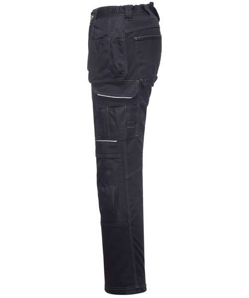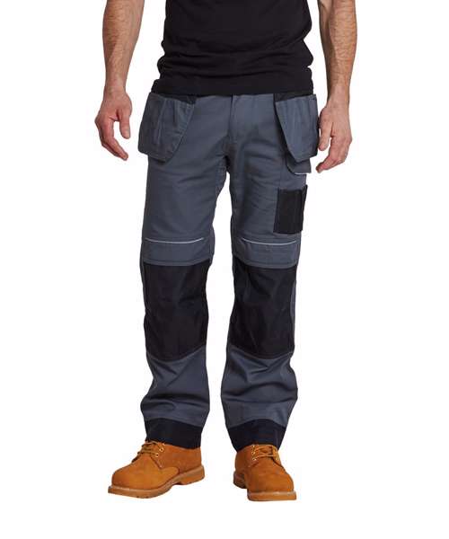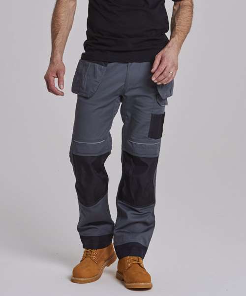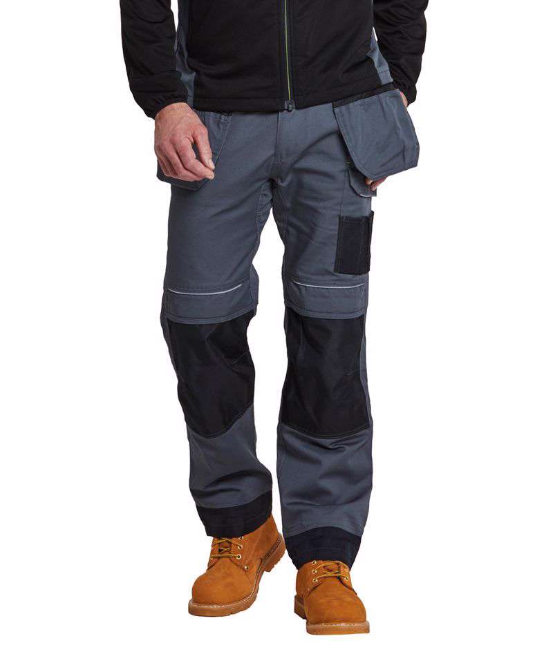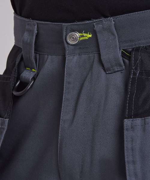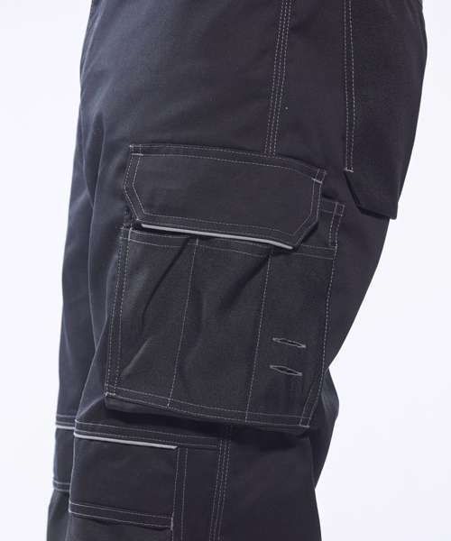 Contrast colour stitching. Contrast panels. Double rule pocket. Hammer loop. Reflective piping. Side pockets. Triple-stitched seams. Two back patch pockets. UPF 50+. Side elastic waist. Holster pockets. Gripper elastic on inner waist. Top-loading knee pad pockets. Smart phone pocket. D-ring. 12-pockets. Cargo pocket on side leg. Adjustable leg length. Reinforced panels . Durable polycotton fabric.