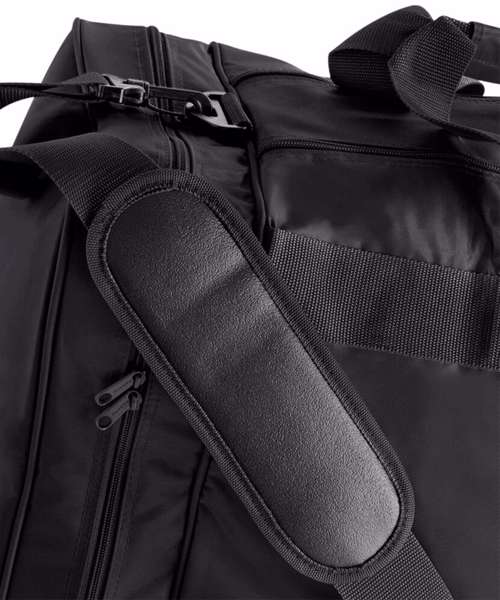 Detachable adjustable shoulder strap with pad. Wet pocket. Racquet pocket. Zippered end pockets. Internal baseboard, Protective base feet. Padded hand grip.