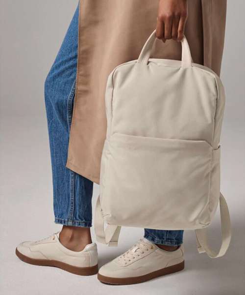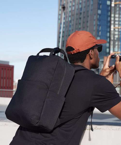 Contains 100% certified recycled polyester. Water-repellent fabric. Padded laptop compartment, compatible up to 16”. Rear internal slip pockets. Large main compartment. Zipped front pocket. Zipped rear security pocket. PU, self-coloured zip pulls. Rear luggage strap. Padded, adjustable shoulder straps. Grab handle. TearAway label for ease of rebranding.