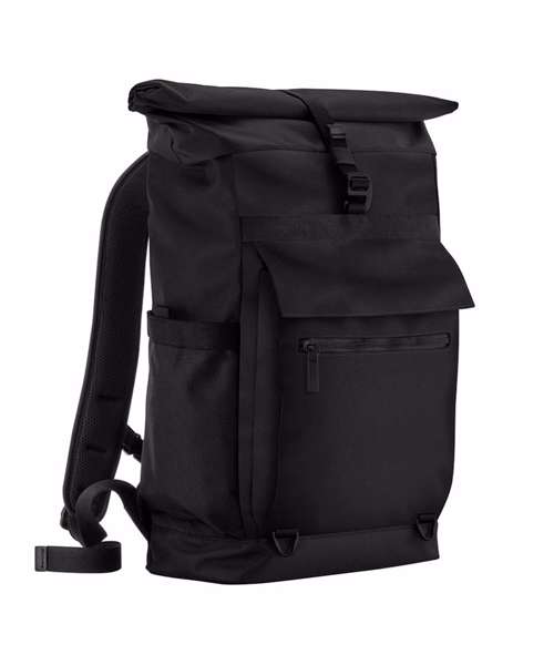 Contains 100% certified recycled polyester. Rear padded laptop compartment, compatible up to 16". Front slip pocket with magnetic closure flap. Easy-access side pockets. Zipped front pocket. PU zip pulls. Roll-top closure. Rear luggage strap. Padded, adjustable shoulder straps. TearAway label for ease of rebranding.