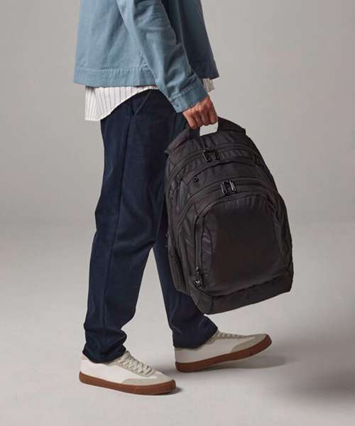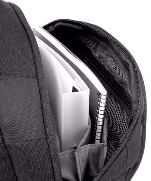 Laptop compatible up to 15.6". Padded laptop compartment. Multiple internal pockets. Padded adjustable shoulder straps. Front pocket organiser section. Ergonomic padded back panel. Document section. Plush lined media pocket with secure closure. Media pocket and headphone port. Zippered side pockets.