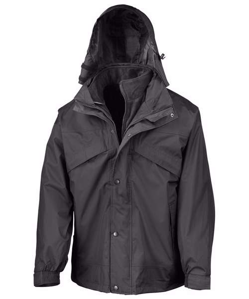 Outer: 230gsm StormDri Polyester with PVC coating. Lining: 100% Polyester. Inner jacket: 280gsm 100% Polyester Active Fleece by Result®