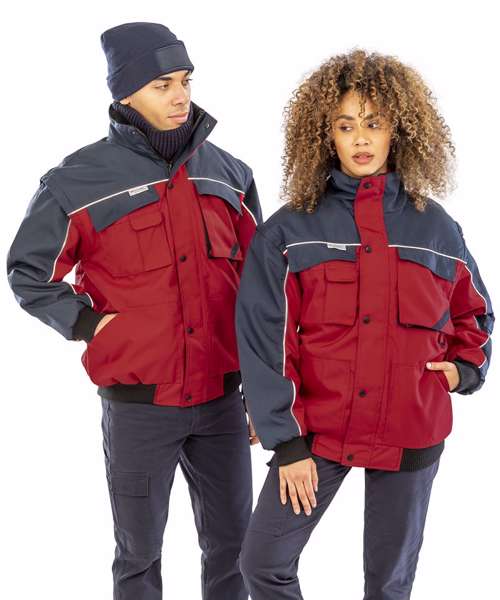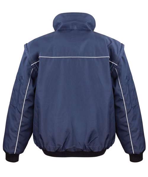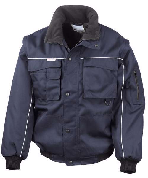 Water repellent. Windproof. Heavy duty. Zip out sleeves. Active fleece by Result® lined collar. Reinforced seams with bar tacked pockets and stress points. Full front zip fastening. 2 Deep front patch pockets, 2 front chest pockets including 2 pen holders, 1 sleeve pocket including 3 pen holders, 1 outside phone pocket, 2 inside pockets and 1 large mesh pocket. 2 D-rings (1 concealed). Cable loops for headphones. Knitted elasticated waist and cuffs. Stud closing storm flap. Piping detail to front, back and sleeves incorporating 3M™ Scotchlite™ reflective materials. This item is suitable for embroidery, digital transfer print and screen print transfer.Decoration Guidelines:Decorating methods: Embroidery, Transfer print & Screen print transfer. Decorators access point: Concealed Inner back zip & left chest pocket.