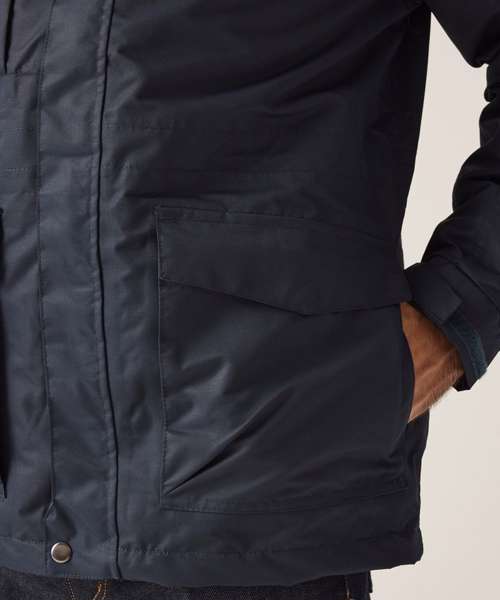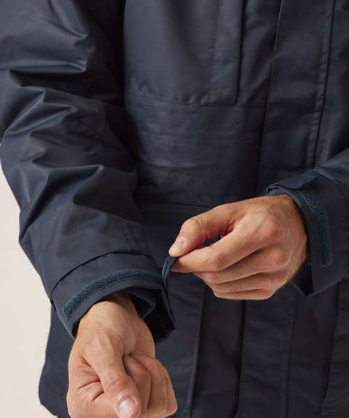 Concealed hood with adjusters. Studded storm flap. Adjustable cuffs. 2 lower pockets with zipped hand warmers and 2 lower cargo pockets. Zipped chest pocket. Adjustable shock cord waist and hem. Concealed zip entrance in lining for embroidery. 2 zipped lower pockets. Fleece cuffs. Adjustable shock cord hem.