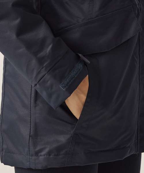 Concealed hood with adjusters. Studded storm flap. Adjustable cuffs. 2 lower pockets with zipped hand warmers and 2 lower cargo pockets. Zipped chest pocket. Adjustable shock cord waist and hem. Concealed zip entrance in lining for embroidery. 2 zipped lower pockets. Fleece cuffs. Adjustable shock cord hem.